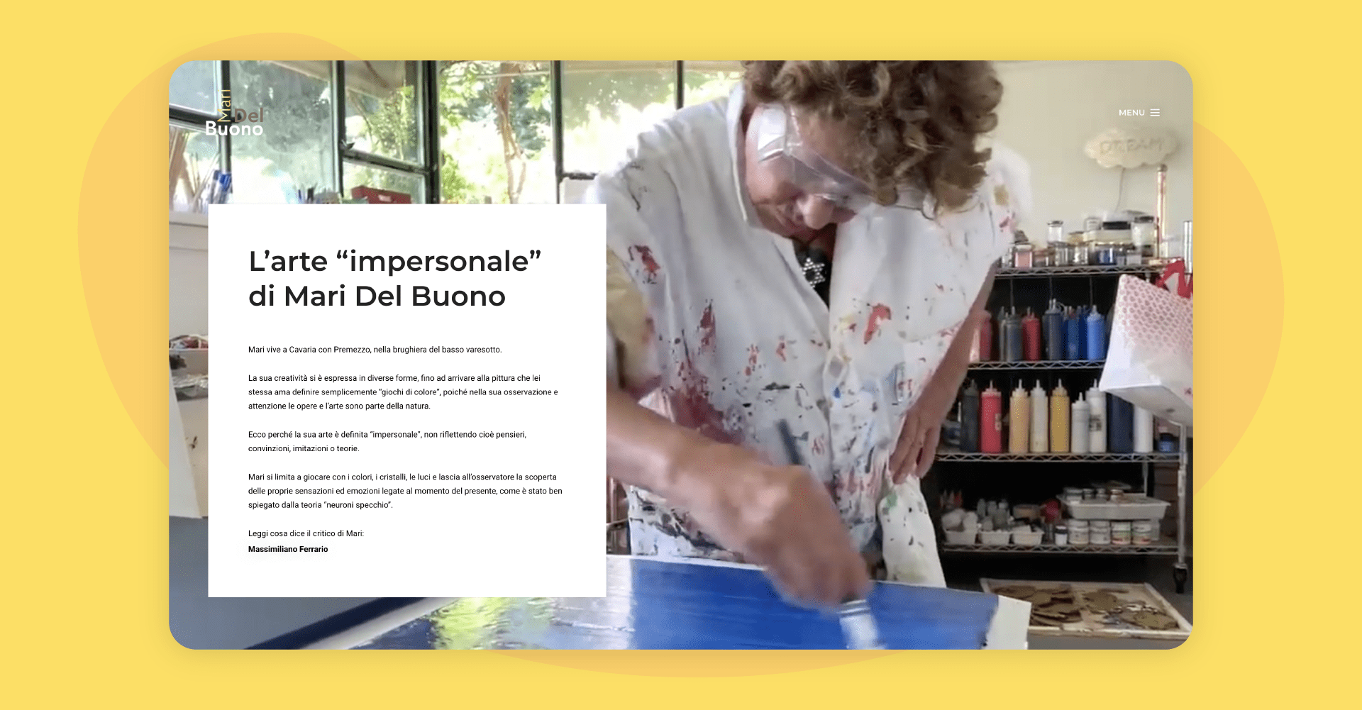 Per la progettazione del design grafico ci siamo fatti ispirare dai quadri di Mari, sviluppando un layout semplice ed elegante in modo da valorizzare le opere.