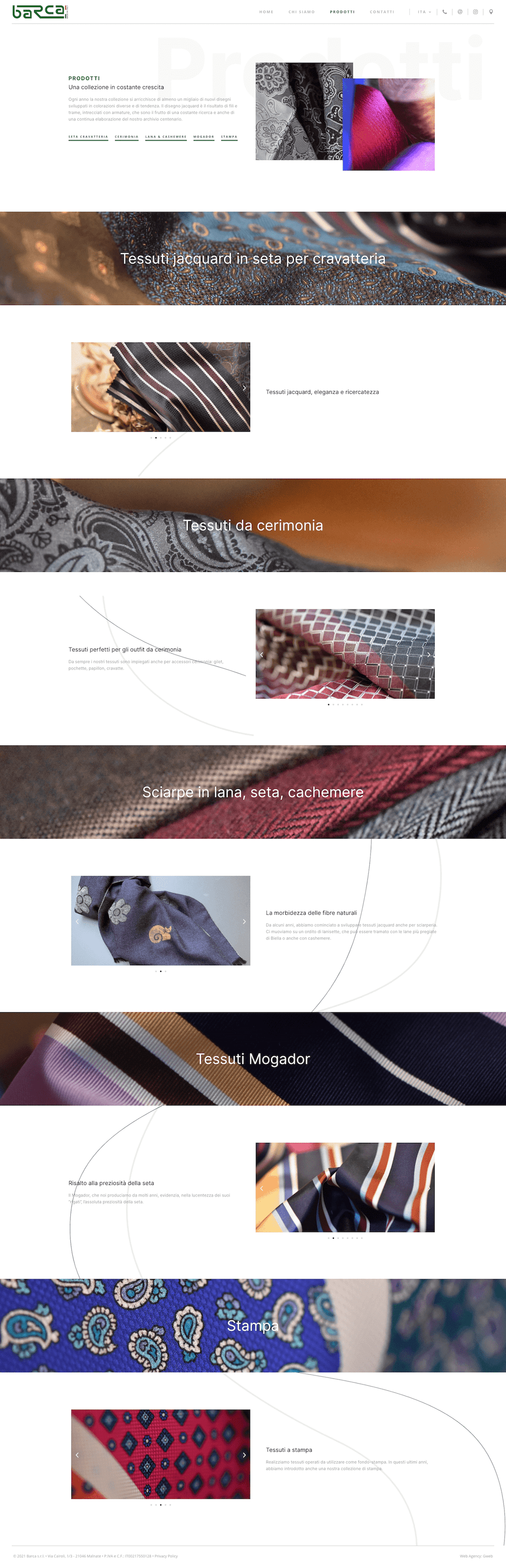 Tra le aree più rilevanti in termini di contenuto, quella dedicata alla produzione: dalla seta al cachemire, le due simboliche linee accompagnano l’utente nella lettura della pagina, affiancandolo nella scoperta dei prodotti Barca.